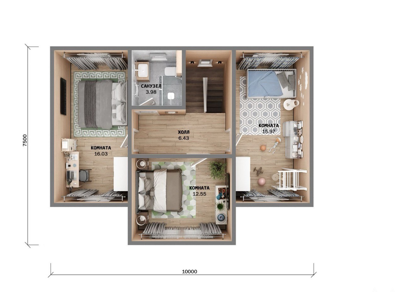 • 3 просторные комнаты